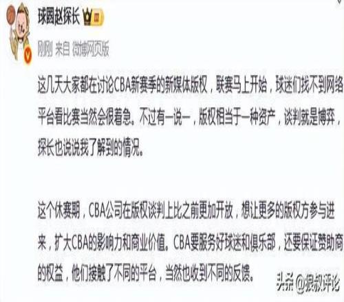 这几天大家都在讨论CBA新赛季的新媒体版权,联赛马上开始,球迷们找不到网络平台看比赛当然会很着急。不过有一说一,版权相当于一种资产,谈判就是博弈,探长也说说我了解到的情况。